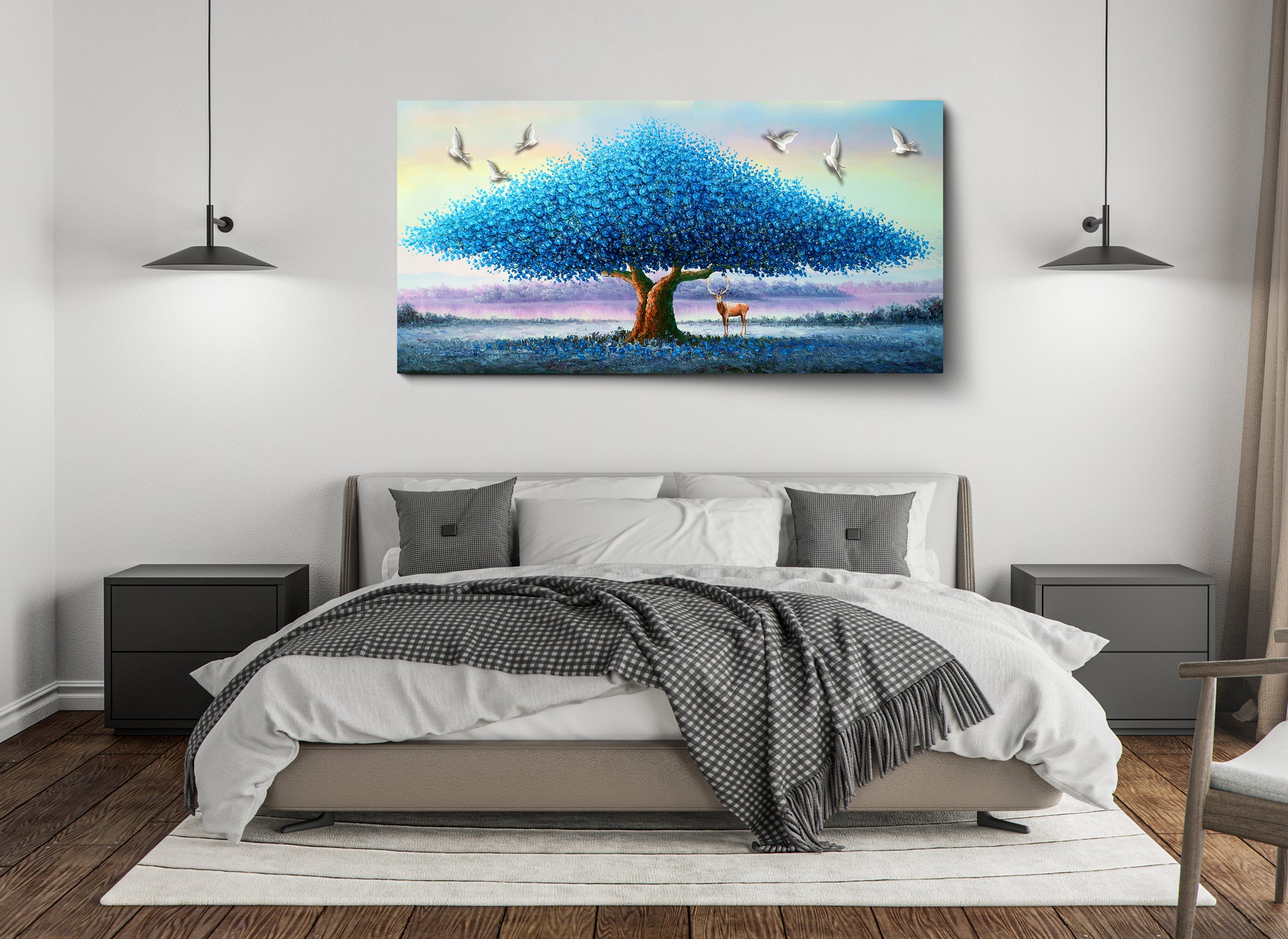 This captivating artwork brings the serene beauty of nature into your home with a unique twist. "Azure Majesty" features a majestic tree adorned with a breathtaking canopy of blue foliage, standing tall against a backdrop of soft pastel hues. A graceful deer grazes peacefully beneath the tree, while white doves soar overhead, creating a scene of tranquility and harmony. Crafted from durable and eco-friendly material, this piece offers a stunning visual focal point while showcasing the beauty of sustainable artistry.